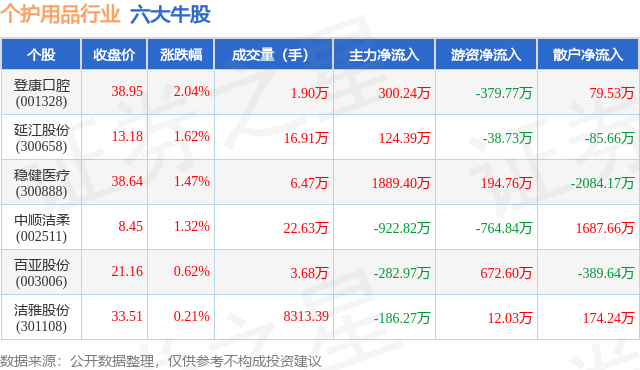 个股表现方面,个护用品行业当日领涨股为登康口腔(001328),该股当日报收38.95,上涨2.04%,成交量1.9万,主力资金净流入300.24万元。延江股份(300658)以上涨1.62%紧随其后,该股当日成交量16.91万,主力资金净流入124.39万元。除此之外,稳健医疗(300888)、中顺洁柔(002511)、百亚股份(003006)均进入当日牛股之列。具体个股列表见下表: