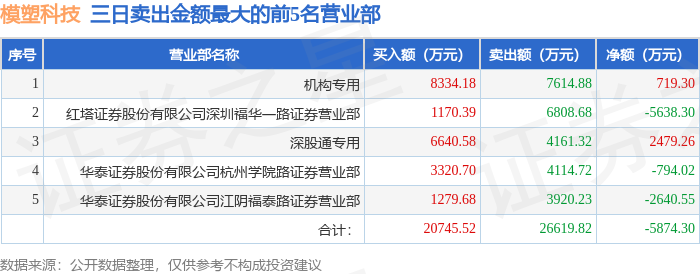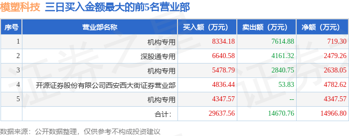 证券之星消息,沪深交易所2025年12月29日公布的交易公开信息显示,模塑科技(000700)因连续三个交易日内,涨幅偏离值累计达到20%的证券登上龙虎榜。此次是近5个交易日内第1次上榜。