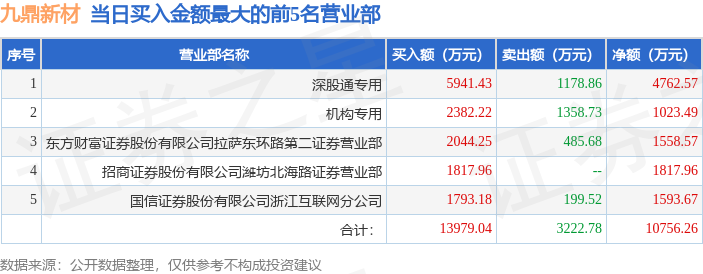 证券之星消息,沪深交易所2025年12月29日公布的交易公开信息显示,九鼎新材(002201)因日跌幅偏离值达到7%的前5只证券登上龙虎榜。此次是近5个交易日内第3次上榜。