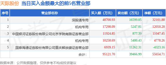从龙虎榜公布的当日买卖数据来看,机构合计净买入1.68亿元,北向资金合计净买入3.21亿元。章盟主、朱雀大街、宁波桑田路等知名游资榜上有名。(知名游资章盟主一般指国泰海通证券股份有限公司上海长宁区江苏路证券营业部席位、知名游资朱雀大街一般指国投证券股份有限公司西安朱雀大街证券营业部席位、知名游资宁波桑田路一般指国盛证券有限责任公司宁波桑田路证券营业部席位,根据市场资料整理,仅供参考)
