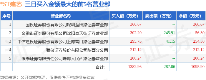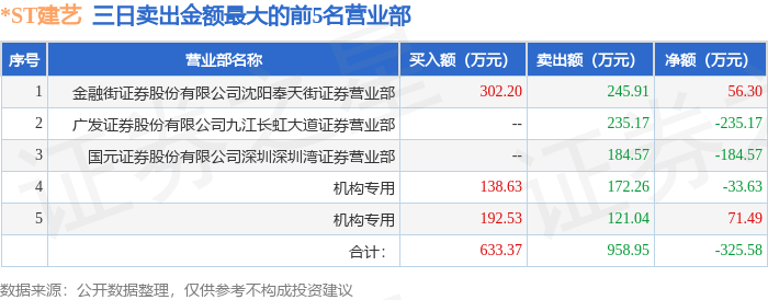 证券之星消息,沪深交易所2025年12月29日公布的交易公开信息显示,*ST建艺(002789)因连续三个交易日内,涨幅偏离值累计达到12%的ST证券、*ST证券和未完成股改证券登上龙虎榜。此次是近5个交易日内第2次上榜。