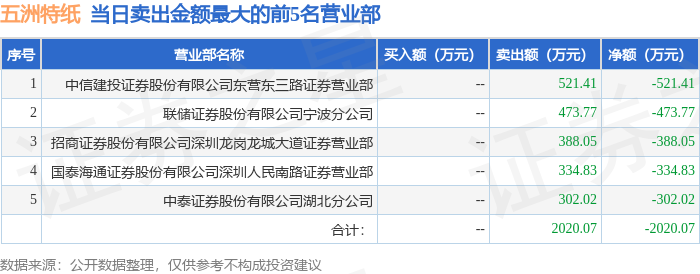 证券之星消息,沪深交易所2025年12月29日公布的交易公开信息显示,五洲特纸(605007)因有价格涨跌幅限制的日收盘价格跌幅偏离值达到7%的前五只证券登上龙虎榜。此次是近5个交易日内第2次上榜。