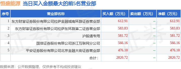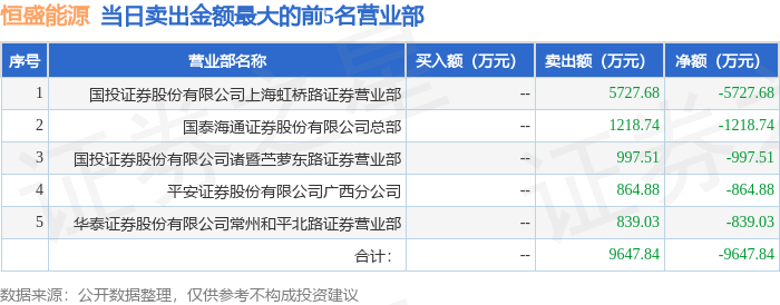 证券之星消息,沪深交易所2025年12月29日公布的交易公开信息显示,恒盛能源(605580)因有价格涨跌幅限制的日收盘价格跌幅偏离值达到7%的前五只证券登上龙虎榜。此次是近5个交易日内第4次上榜。