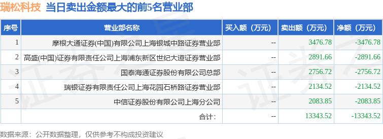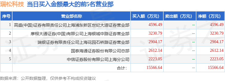 证券之星消息,沪深交易所2025年12月29日公布的交易公开信息显示,瑞松科技(688090)因有价格涨跌幅限制的日收盘价格涨幅达到15%的前五只证券登上龙虎榜。此次是近5个交易日内第1次上榜。