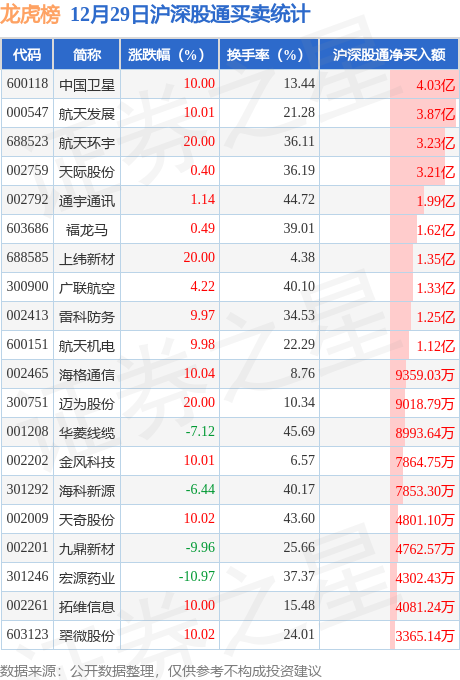 龙虎榜中有沪股通/深股通专用席位(北向资金)现身的个股共30家,其中中国卫星以净买入4.03亿元排名第一。详情见下表: