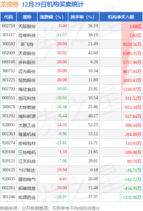 当日公布的交易所龙虎榜中有机构专用席位现身的个股共33家,其中天际股份以净买入1.68亿元排名第一。详情见下表: