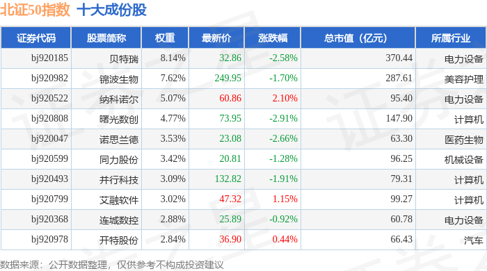 证券之星消息,12月29日,北证50(899050)指数报收于1456.45点,跌0.45%,成交184.79亿元,换手率3.25%。当日该指数成份股中,上涨的有17家,吉林碳谷以23.65%的涨幅领涨,下跌的有33家,天力复合以5.79%的跌幅领跌。