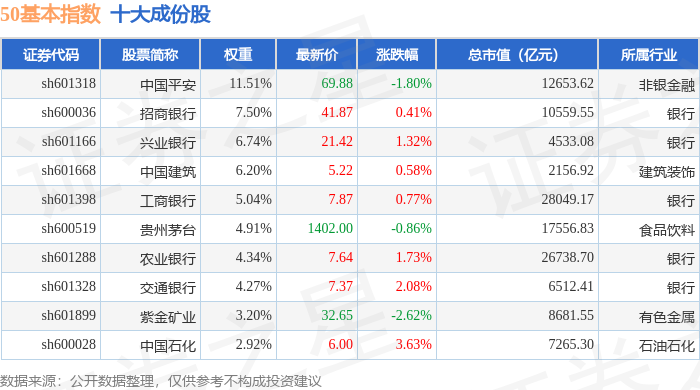 50基本(000052)指数十大成份股详情如下: