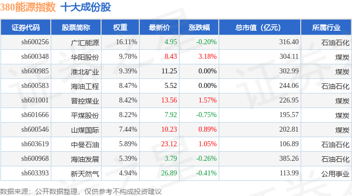 380能源(000104)指数十大成份股详情如下: