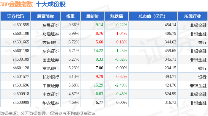 证券之星消息,12月29日,380金融(000110)指数报收于4289.36点,跌0.23%,成交72.2亿元,换手率0.94%。当日该指数成份股中,上涨的有6家,浙江东方以1.3%的涨幅领涨,下跌的有13家,中银证券以2.49%的跌幅领跌。