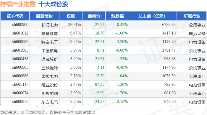 证券之星消息,12月29日,持续产业(000114)指数报收于1255.07点,跌1.02%,成交251.54亿元,换手率0.95%。当日该指数成份股中,上涨的有7家,双良节能以9.95%的涨幅领涨,下跌的有31家,阿特斯以5.2%的跌幅领跌。