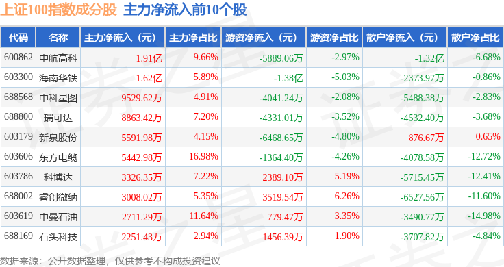 资金流向方面,上证100(000132)指数成份股当日主力资金净流出合计11.99亿元,游资资金净流入合计2.97亿元,散户资金净流入合计9.02亿元。成份股资金流向详情见下表: