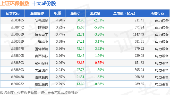 上证环保(000158)指数十大成份股详情如下: