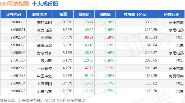 800可选(000931)指数十大成份股详情如下: