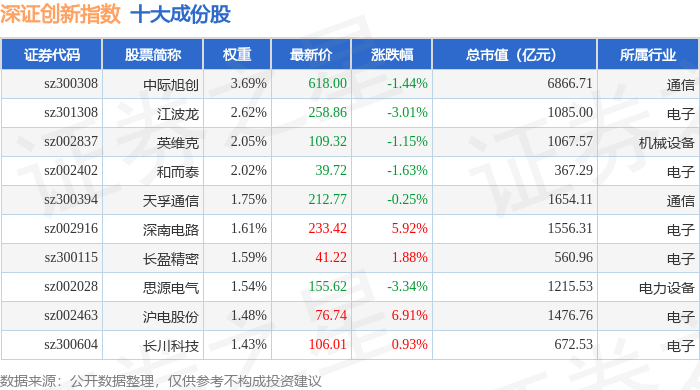 深证创新(399016)指数十大成份股详情如下: