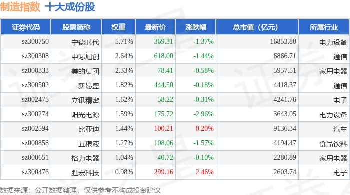 证券之星消息,12月29日,制造指数(399233)报收于3511.44点,跌0.38%,成交9522.64亿元,换手率3.55%。当日该指数成份股中,上涨的有782家,迈为股份以20.0%的涨幅领涨,下跌的有1109家,大烨智能以16.38%的跌幅领跌。