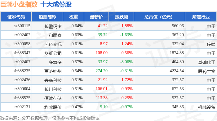 证券之星消息,12月29日,巨潮小盘(399316)指数报收于5962.46点,跌0.44%,成交3294.75亿元,换手率1.91%。当日该指数成份股中,上涨的有145家,迈为股份以20.0%的涨幅领涨,下跌的有337家,厦门国贸以9.98%的跌幅领跌。