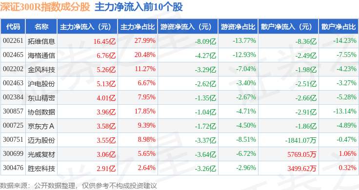 资金流向方面,深证300R(399344)指数成份股当日主力资金净流出合计123.34亿元,游资资金净流入合计28.14亿元,散户资金净流入合计95.2亿元。成份股资金流向详情见下表: