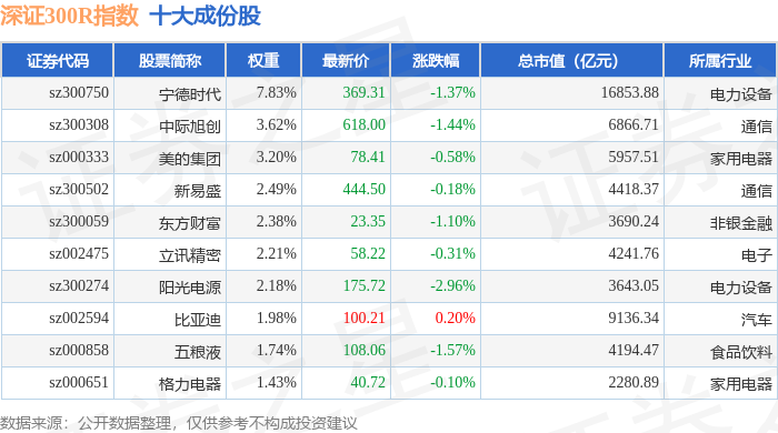 深证300R(399344)指数十大成份股详情如下: