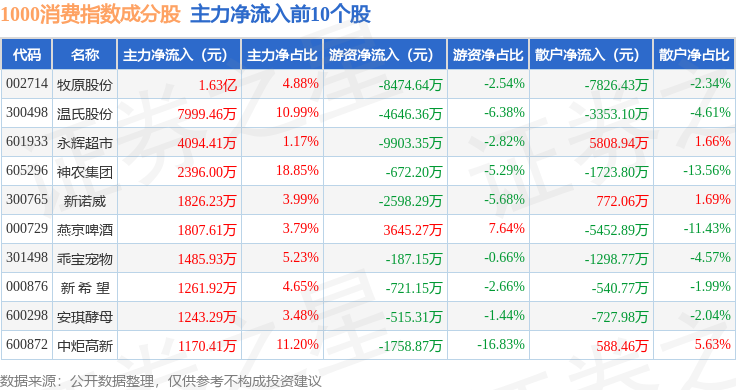 资金流向方面,1000消费(399385)指数成份股当日主力资金净流出合计14.18亿元,游资资金净流入合计3.11亿元,散户资金净流入合计11.07亿元。成份股资金流向详情见下表: