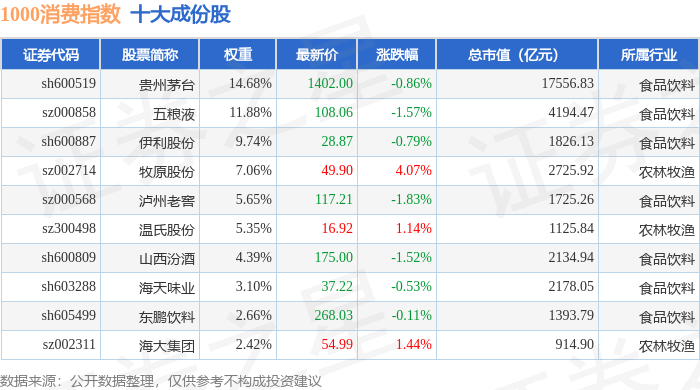 证券之星消息,12月29日,1000消费(399385)指数报收于9406.2点,跌0.52%,成交279.36亿元,换手率1.7%。当日该指数成份股中,上涨的有13家,牧原股份以4.07%的涨幅领涨,下跌的有38家,正邦科技以6.74%的跌幅领跌。
