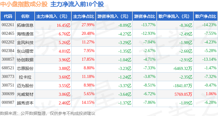 资金流向方面,中小盘(399401)指数成份股当日主力资金净流出合计220.83亿元,游资资金净流入合计27.06亿元,散户资金净流入合计192.83亿元。成份股资金流向详情见下表: