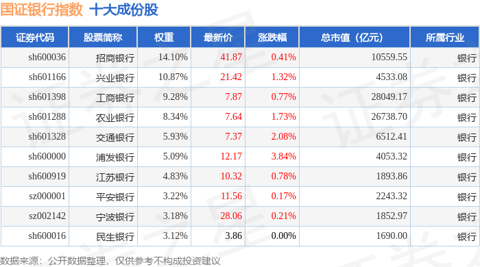 证券之星消息,12月29日,国证银行(399431)指数报收于8002.33点,涨1.07%,成交249.45亿元,换手率0.23%。当日该指数成份股中,上涨的有22家,浦发银行以3.84%的涨幅领涨,下跌的有5家,成都银行以1.22%的跌幅领跌。