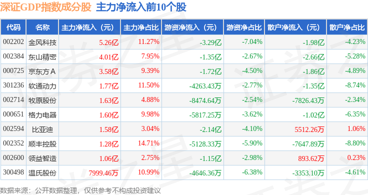 资金流向方面,深证GDP(399648)指数成份股当日主力资金净流出合计56.8亿元,游资资金净流入合计20.2亿元,散户资金净流入合计36.61亿元。成份股资金流向详情见下表: