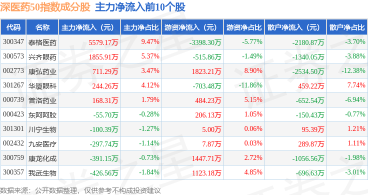 资金流向方面,深医药50(399647)指数成份股当日主力资金净流出合计12.44亿元,游资资金净流入合计4.67亿元,散户资金净流入合计7.77亿元。成份股资金流向详情见下表:
