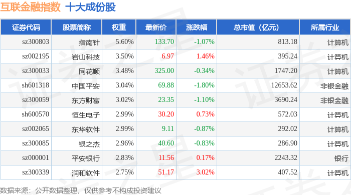 资金流向方面,互联金融(399805)指数成份股当日主力资金净流出合计6528.52万元,游资资金净流入合计347.61万元,散户资金净流入合计6133.11万元。成份股资金流向详情见下表: