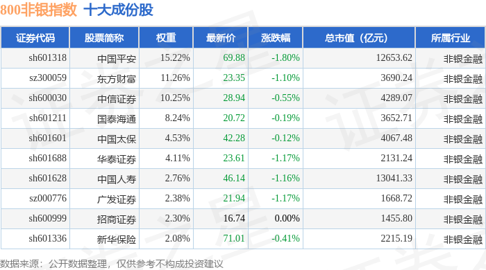 证券之星消息,12月29日,800非银(399966)指数报收于6679.97点,跌0.83%,成交345.41亿元,换手率0.66%。当日该指数成份股中,上涨的有3家,财通证券以1.04%的涨幅领涨,下跌的有43家,中银证券以2.49%的跌幅领跌。