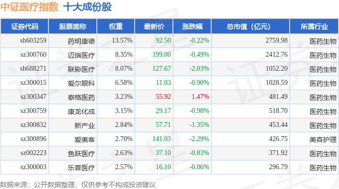 证券之星消息,12月29日,中证医疗(399989)指数报收于6859.71点,跌0.73%,成交154.96亿元,换手率1.44%。当日该指数成份股中,上涨的有9家,美好医疗以8.3%的涨幅领涨,下跌的有39家,福瑞医科以4.2%的跌幅领跌。