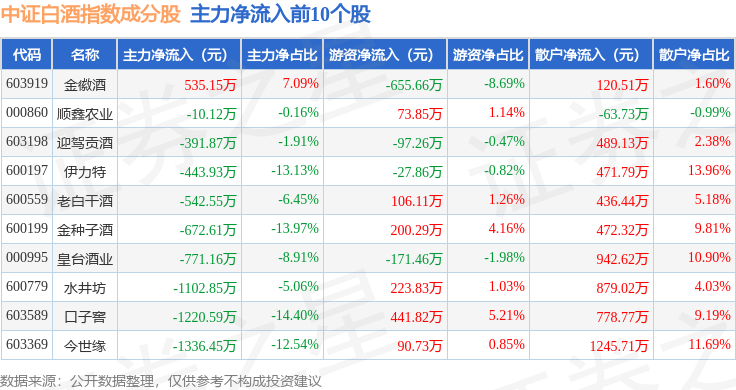资金流向方面,中证白酒(399997)指数成份股当日主力资金净流出合计12.76亿元,游资资金净流入合计4.13亿元,散户资金净流入合计8.63亿元。成份股资金流向详情见下表: