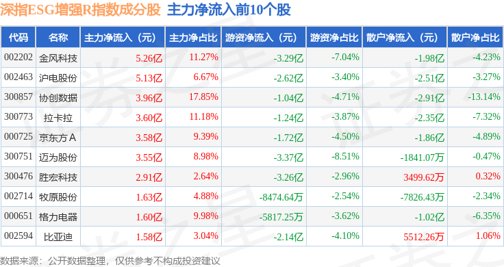 资金流向方面,深指ESG增强R(470032)指数成份股当日主力资金净流出合计100.33亿元,游资资金净流入合计26.2亿元,散户资金净流入合计74.12亿元。成份股资金流向详情见下表: