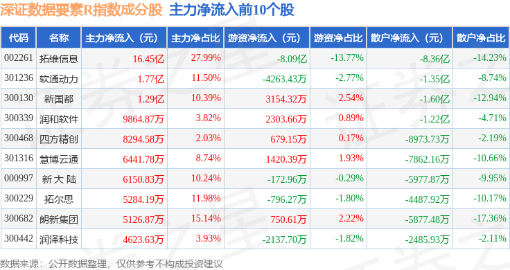 资金流向方面,深证数据要素R(470053)指数成份股当日主力资金净流入合计1.7亿元,游资资金净流出合计3.69亿元,散户资金净流入合计1.99亿元。成份股资金流向详情见下表: