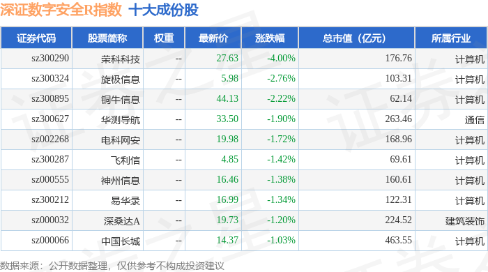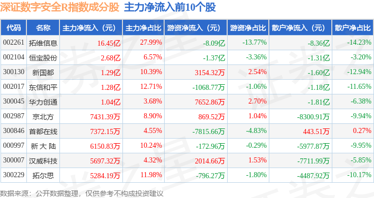 资金流向方面,深证数字安全R(470052)指数成份股当日主力资金净流入合计16.85亿元,游资资金净流出合计6.63亿元,散户资金净流出合计10.23亿元。成份股资金流向详情见下表: