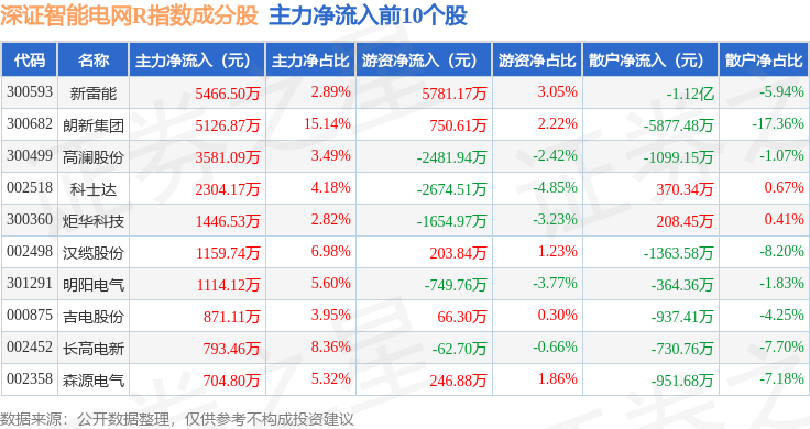 资金流向方面,深证智能电网R(470054)指数成份股当日主力资金净流出合计22.69亿元,游资资金净流入合计6.52亿元,散户资金净流入合计16.16亿元。成份股资金流向详情见下表: