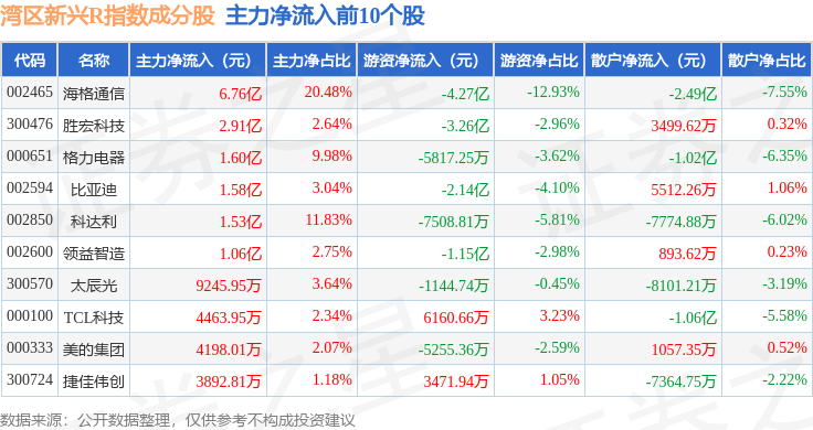 资金流向方面,湾区新兴R(480007)指数成份股当日主力资金净流出合计51.66亿元,游资资金净流入合计1.37亿元,散户资金净流入合计50.29亿元。成份股资金流向详情见下表:
