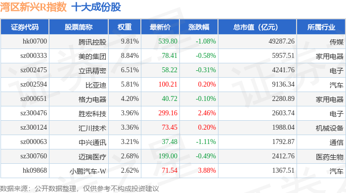 湾区新兴R(480007)指数十大成份股详情如下:
