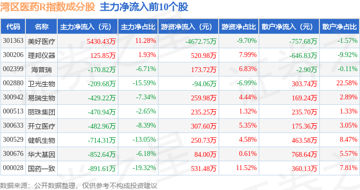 资金流向方面,湾区医药R(480013)指数成份股当日主力资金净流出合计3.62亿元,游资资金净流入合计6535.06万元,散户资金净流入合计2.97亿元。成份股资金流向详情见下表: