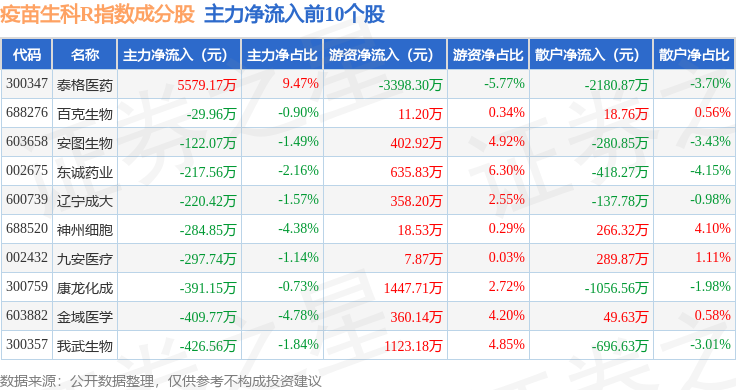 资金流向方面,疫苗生科R(480015)指数成份股当日主力资金净流出合计13.11亿元,游资资金净流入合计7.02亿元,散户资金净流入合计6.09亿元。成份股资金流向详情见下表: