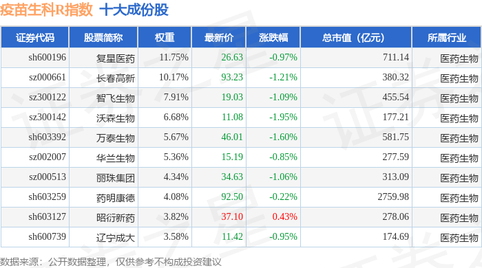 证券之星消息,12月29日,疫苗生科R(480015)指数报收于7683.39点,跌1.0%,成交159.73亿元,换手率0.8%。当日该指数成份股中,上涨的有5家,泰格医药以1.47%的涨幅领涨,下跌的有43家,我武生物以3.42%的跌幅领跌。