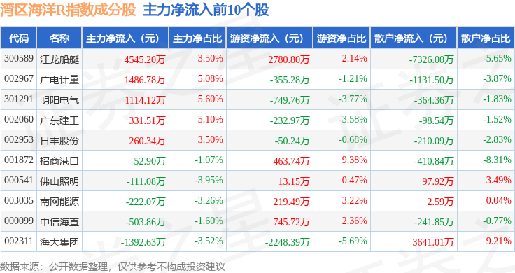 资金流向方面,湾区海洋R(480019)指数成份股当日主力资金净流出合计1.27亿元,游资资金净流入合计7067.92万元,散户资金净流入合计5655.16万元。成份股资金流向详情见下表: