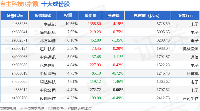 自主科技R(480033)指数十大成份股详情如下: