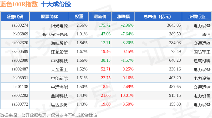 证券之星消息,12月29日,蓝色100R(480068)指数报收于4749.54点,跌0.44%,成交579.88亿元,换手率1.24%。当日该指数成份股中,上涨的有38家,金风科技以10.01%的涨幅领涨,下跌的有58家,北部湾港以7.77%的跌幅领跌。