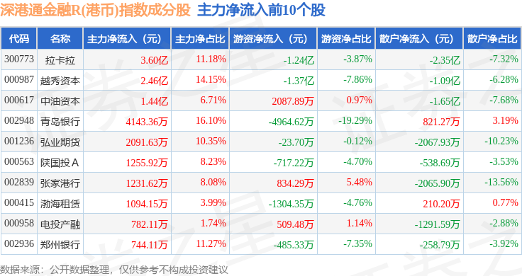 资金流向方面,深港通金融R(港币)(483026)指数成份股当日主力资金净流出合计4.88亿元,游资资金净流入合计2.61亿元,散户资金净流入合计2.27亿元。成份股资金流向详情见下表: