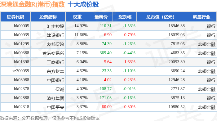 深港通金融R(港币)(483026)指数十大成份股详情如下: