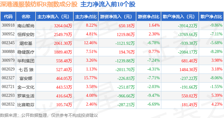 资金流向方面,深港通服装纺织R(483041)指数成份股当日主力资金净流出合计2.38亿元,游资资金净流入合计2531.59万元,散户资金净流入合计2.13亿元。成份股资金流向详情见下表: