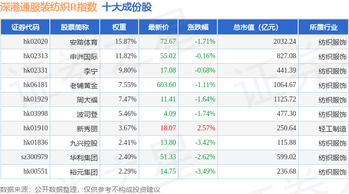 深港通服装纺织R(483041)指数十大成份股详情如下: