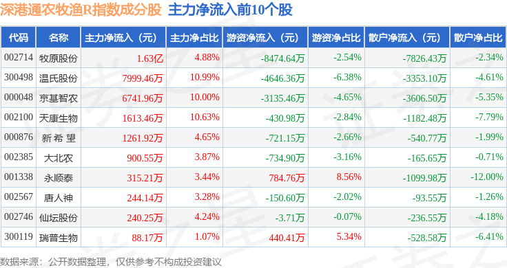 资金流向方面,深港通农牧渔R(483051)指数成份股当日主力资金净流入合计5549.26万元,游资资金净流出合计1.31亿元,散户资金净流入合计7535.86万元。成份股资金流向详情见下表: